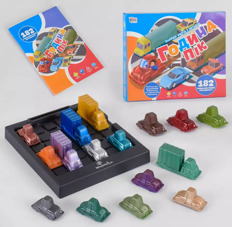 Розвиваюча гра "Година пік" - це нова захоплююча настільна гра від «4Fun Game Club». Мета гри: потрібно вивести автомобіль з дорожньої пробки, за найменшу кількість ходів. З кожним рівнем завдання будуть ускладнюватися. Хід гри: пересувайте автомобілі вперед або назад у напрямку їх руху, щоб розблокувати вихід для червоної машини. Забороняється підіймати автомобілі над платформою. Всі завдання розділені на 5 рівнів складності, від "новачка" до рівня "майстра". Комплектація: - 16 автомобілів; - ігрова платформа; - книга зі 182 завданнями.