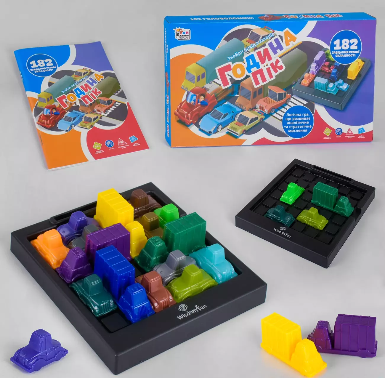 Розвивальна головоломка від "4FUN Game Club" ставить дуже складне і захопливе питання перед гравцями: Як знайти вихід з пробки? З настільною грою "Час пік" ви зможете зануриться в цікаву логічну головоломку і пройти 182 завдань різної складності! Іграшка являє собою платформу на якій будуть розташовуватися машини, як тягачі, так і легкові автомобілі, які необхідно вибудувати таким чином, щоб червона машина завжди змогла виїхати. Комплектація: - платформа для гри; - 16 машинок; - інструкція українською мовою.