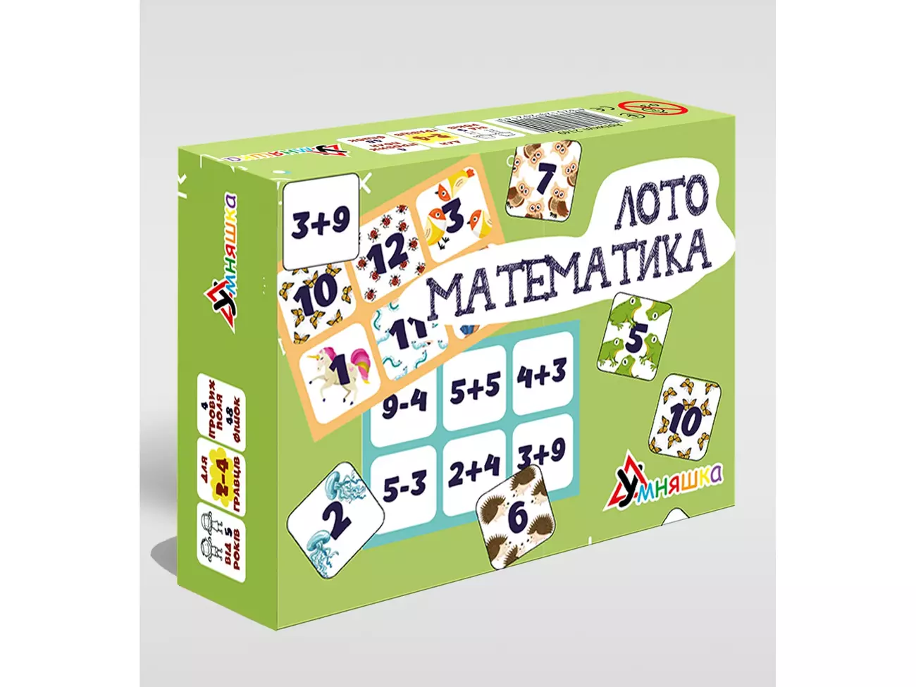 Завдяки цій грі дитина зможе потренувати навички додавання та віднімання. Поля та фішки містять математичні приклади та відповіді до них з картинками. Можна обрати декілька варіантів гри, окрім класичного! Склад: 4 двосторонніх поля, 48 фішок Розмір коробки: 20х15х5 Для дітей від 5 років.