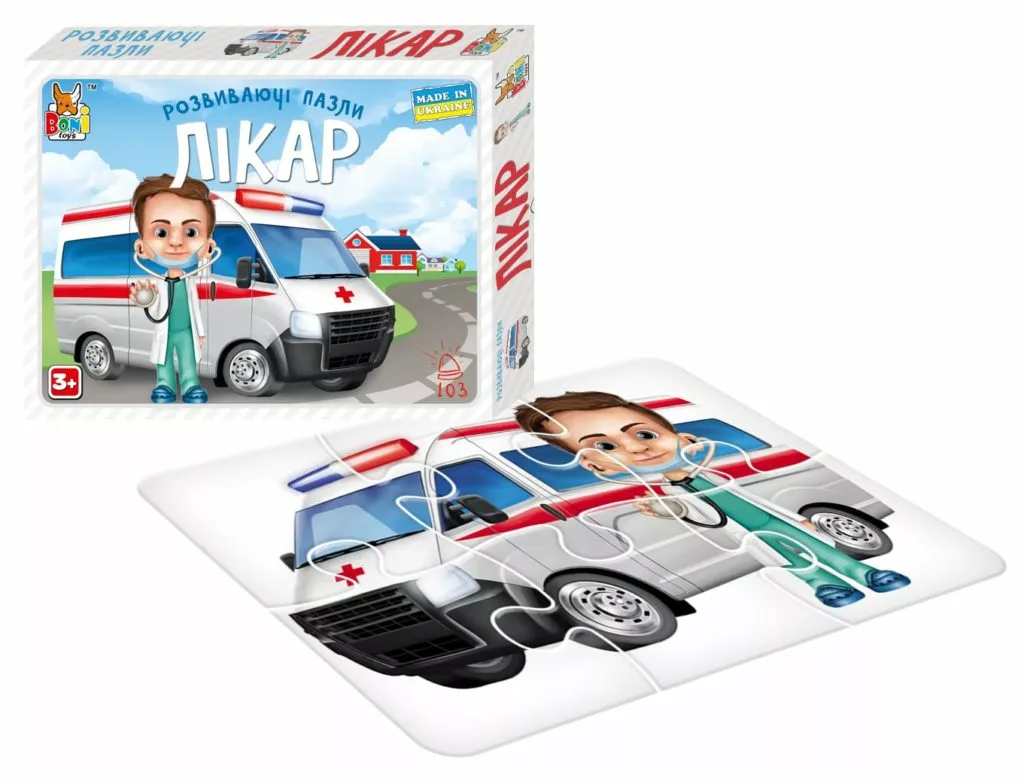 Розвиваючі пазли «Лікар» – це цікава розвиваюча і навчальна гра, яка вимагає посидючості, акуратності, терпіння і уважності. Збираючи картину, дитина пізнає зв’язки між частиною і цілим, розвиває логічне мислення і дрібну моторику рук. Використання пазлів як розвиваюча іграшка для дитини можна практикувати з найперших днів під пильною увагою батьків. Якщо батьки зможуть прищепити інтерес у свого малюка до цієї чудової гри, то згодом дитина зможе не тільки добитися значного прогресу в своєму розвитку, але і у всієї сім`ї з`явиться нова цікава гра, якій завжди можна присвятити тихі сумісні сімейні вечори. Поле (розмір 410х290 мм) складається з шести елементів (пазлів). Комплект гри містить: пазли—6 шт., пакувальна коробка —1 шт. Опис Габаритний розмір коробки: 326х252х40 мм Вікова категорія : 3+ Кількість гравців: від 1-го до 4-х учасників