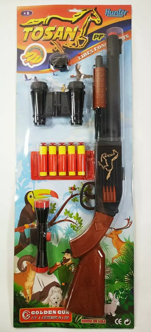 "Тосан ПФ" рушниця стріляє м'якими поролоновими кулями на присосках Довжина - 50 см Висота - 10 см. Комплект: рушниця, чотири м'які поролонові кулі на присосках, оптичний приціл, бінокль чорного кольру, ремінь поліпропіленовий. Упаковка: поліпропіленова на картонній основі. Вага: 310 грам. Артикул: 925 В ящику: 24шт.