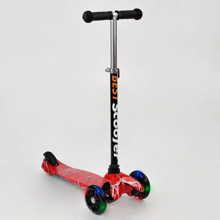 Триколісний самокат Best Scooter в стильному оформленні з відмінними характеристиками і яскравими колесами, що світяться - все, що необхідно для активного відпочинку дитини! Алюмінієве Т-подібне кермо надійно кріпиться до рами самокату. Висота керма має кілька рівнів регулювання та додаткову скобу для надійної фіксації. Ручки виконані з якісної гуми з рельєфним візерунком, що запобігає ковзанню рук. Для більшої стійкості та безпеки дитини, конструкція самокату складається з трьох коліс – два передні та одне заднє. Завдяки підшипникам типу ABEC-7 самокат Best Scooter їздить швидко та легко. За рахунок матеріалу з якого виготовлені колеса даної моделі – поліуретан – самокат безшумний, а їзда на ньому м'яка та комфортна. Усі три колеса під час руху світяться різнобарвними вогниками. Best Scooter оснащений ножним гальмом, що наступає (step-on brake), який розміщений над заднім колесом. Характеристики: • Розміри самокату: Довжина – 55 см; Ширина деки – 11 см; Мінімальна висота керма від підлоги – 55 см, максимальна висота керма – 65 см; Ширина керма – 26 см, діаметр ручок: 3.5 см; • Розміри коліс: Передні колеса: діаметр – 11 см, ширина – 2.5 см; Заднє колесо: діаметр – 7.5 см, ширина – 2.5 см.