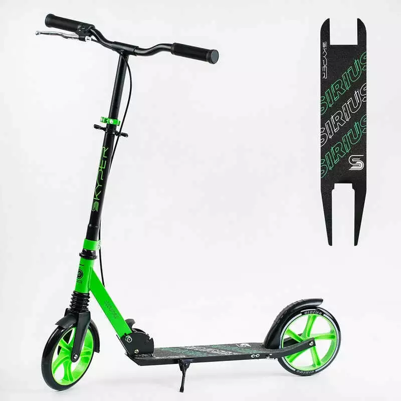 Самокат двоколісний S-64361 ""Skyper"" (4) ""Sirius"", салатово-чорний, колеса PU 200 мм, 1 амортизатор, ручне гальмо, в коробці