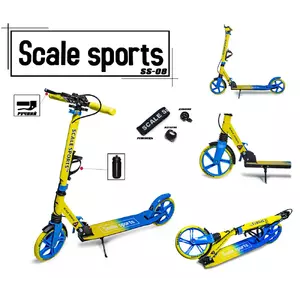 <p>Стильный самокат<strong> Scooter Scale Sports SS-08 с ручным тормозом</strong> разработан для подростков и взрослых американской компанией <strong>Scale Sports.</strong></p><br /> <p><strong>Особенности самоката Scale Sports SS-08</strong><strong>:</strong></p><br /> <ul><br /> <li>Складная конструкция;</li><br /> <li>Дзвонок на руле.</li><br /> <li>LED-фонарик (три режима подсветки)</li><br /> <li>Держатель для бутылки</li><br /> <li>Ручной тормоз выведен на заднее колесо;</li><br /> <li>Ножной металлический тормоз;</li><br /> <li>Регулируемый руль на три положения;</li><br /> <li>Резиновые ручки;</li><br /> <li>Амортизатор -1 (передний);</li><br /> <li>Ножка для парковки (подножка)<strong>;</strong></li><br /> <li>Нескользящее покрытие платформы ;</li><br /> <li>Максимальная нагрузка: 100 кг;</li><br /> </ul><br /> <p><strong>Технические характеристики самоката Scale Sports SS-08 :</strong></p><br /> <ul><br /> <li>Тип самоката: городской;</li><br /> <li>Количество шт., тип колес: 2 литых;</li><br /> <li>Материал колес: полиуретан;</li><br /> <li>Размер переднего и заднего колеса – 200 мм;</li><br /> <li>Габаритный размер (ДхШ): 88х12</li><br /> <li>Высота регулируется в 3 положениях: <a href="tel:91/98/105">88/96</a>/103 см;</li><br /> <li>Платформа: 57х12 см;</li><br /> <li>Вес самоката: 4 кг;</li><br /> <li>Материал рамы: алюминий;</li><br /> <li>Цвет: желто-голубой;</li><br /> <li>Возрастная группа: для подростков и взрослых, <strong>7</strong>+;</li><br /> </ul><br />