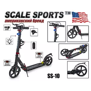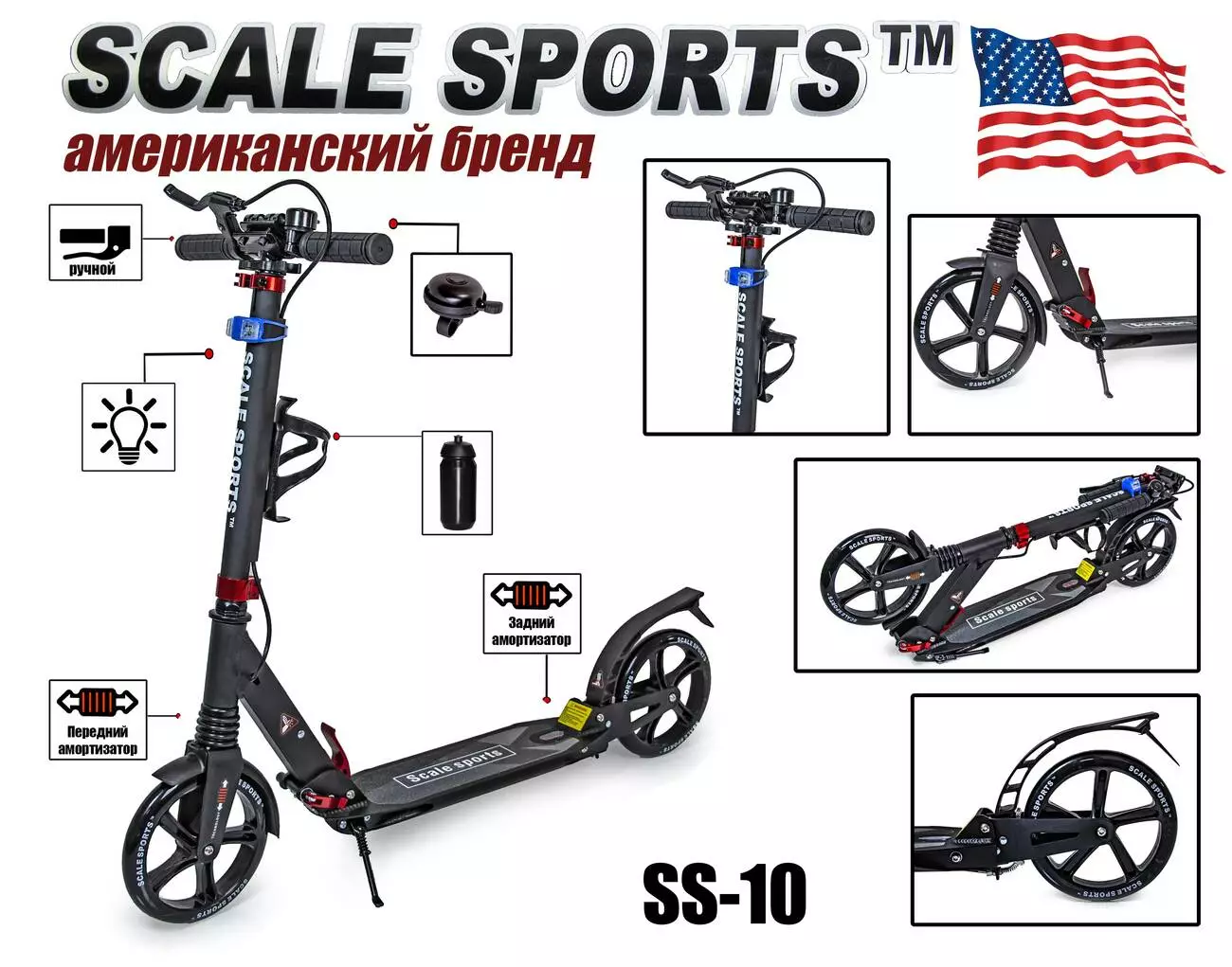 <p>Стильный самокат<strong> Scooter Scale Sports SS-10 с ручным тормозом</strong> разработан для подростков и взрослых американской компанией <strong>Scale Sports.</strong></p><br /> <br /> <p><strong>Особенности самоката Scale Sports SS-10</strong><strong>:</strong></p><br /> <br /> <ul><br /> <li>Складная конструкция;</li><br /> <li>Ручной тормоз выведен на заднее колесо;</li><br /> <li>Дзвонок на руле.</li><br /> <li>LED-фонарик (три режима подсветки)</li><br /> <li>Ножной металлический тормоз;</li><br /> <li>Регулируемый руль на три положения;</li><br /> <li>Держатель для бутылки</li><br /> <li>Резиновые ручки;</li><br /> <li>Амортизатор - (передний и задний);</li><br /> <li>Ножка для парковки (подножка)<strong>;</strong></li><br /> <li>Нескользящее покрытие платформы ;</li><br /> <li>Максимальная нагрузка: 100 кг;</li><br /> </ul><br /> <br /> <p><strong>Технические характеристики самоката Scale Sports SS-10 :</strong></p><br /> <br /> <ul><br /> <li>Тип самоката: городской;</li><br /> <li>Количество шт., тип колес: 2 литых;</li><br /> <li>Материал колес: полиуретан;</li><br /> <li>Размер переднего и заднего колеса – 200 мм;</li><br /> <li>Высота регулируется в 3 положениях(от пола): <a href="tel:91/98/105">8</a>8\97\103 см;</li><br /> <li>Платформа: 46х13 см;</li><br /> <li>Вес самоката: 5.5 кг;</li><br /> <li>Материал рамы: алюминий;</li><br /> <li>Цвет: черный;</li><br /> <li>Возрастная группа: для подростков и взрослых, <strong>7</strong>+;</li><br /> </ul><br /> <br /> <p><iframe frameborder="0" height="315" src="https://www.youtube.com/embed/jhkXrXFP8gE" width="560"></iframe></p><br />