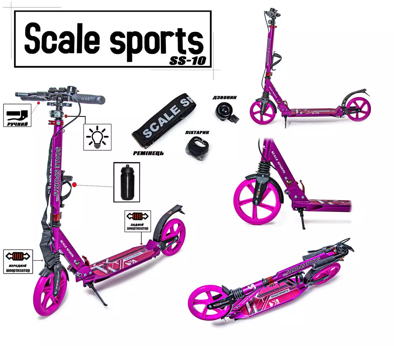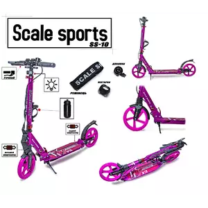<p>Стильный самокат<strong> Scooter Scale Sports SS-10 с ручным тормозом</strong> разработан для подростков и взрослых американской компанией <strong>Scale Sports.</strong></p><br /> <p><strong>Особенности самоката Scale Sports SS-10</strong><strong>:</strong></p><br /> <ul><br /> <li>Ручной тормоз выведен на заднее колесо;</li><br /> <li>Ножной металлический тормоз;</li><br /> <li>Регулируемый руль на три положения;</li><br /> <li>Держатель для бутылки</li><br /> <li>Резиновые ручки;</li><br /> <li>Амортизатор - (передний и задний);</li><br /> <li>Ножка для парковки (подножка)<strong>;</strong></li><br /> <li>Нескользящее покрытие платформы ;</li><br /> <li>Максимальная нагрузка: 100 кг;</li><br /> </ul><br /> <p><strong>Технические характеристики самоката Scale Sports SS-10 :</strong></p><br /> <ul><br /> <li>Тип самоката: городской;</li><br /> <li>Количество шт., тип колес: 2 литых;</li><br /> <li>Материал колес: полиуретан;</li><br /> <li>Размер переднего и заднего колеса – 200 мм;</li><br /> <li>Высота регулируется в 3 положениях(от пола): <a href="tel:91/98/105">8</a>8\97\103 см;</li><br /> <li>Платформа: 46х13 см;</li><br /> <li>Вес самоката: 5.5 кг;</li><br /> <li>Материал рамы: алюминий;</li><br /> <li>Цвет: розовый;</li><br /> <li>Возрастная группа: для подростков и взрослых, <strong>7</strong>+;</li><br /> </ul><br />