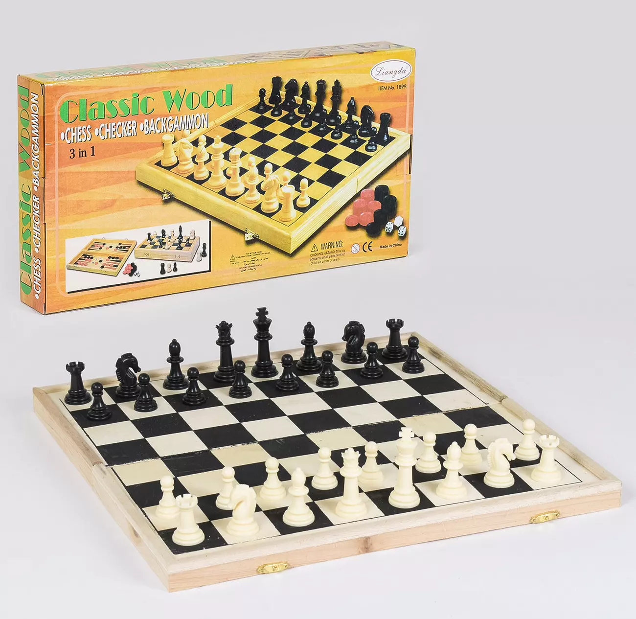 Шахи "3 в1" З 36816 являють собою комплект з трьох ігор: шахи, нарди і шашки. Гра розвиває логічне мислення, концентрацію, пам'ять, аналітичні здібності, вчить бути спостережливим і мислити стратегічно. У наборі: • ігрова дошка дерев'яна з шаховим (шашковий) полем із зовнішнього боку і полем для гри в нарди на внутрішній; • шахові фігури (16 білих + 16 чорних); • ігрові кубики (2 шт.); • шашки (15 білих + 15 чорних); Розмір ігрового поля 39 х 39 см. Матеріал дошки: дерево. Матеріал шашок: дерево. Матеріал шахових фігур: пластик.