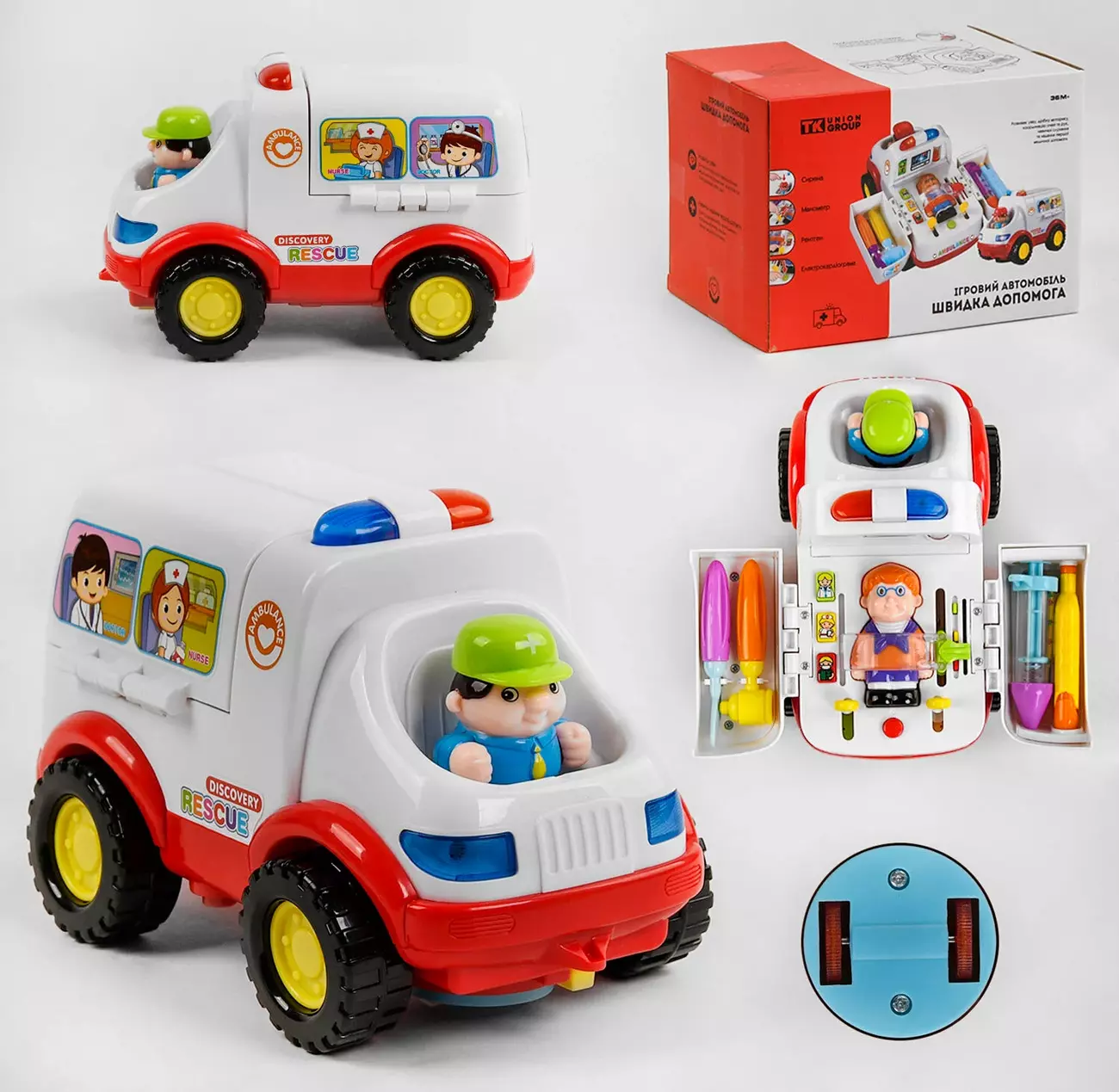 Багатофункціональна іграшка «Швидка допомога» з набором інструментів та пацієнтом дозволить дитині ближче познайомитися з медициною, та розвинути у ній деякі корисні навички. Машинка відразу приверне увагу малюка, оскільки має різноманітність світлових і звукових ефектів. Якщо доторкнутися до водія, іграшка починає їхати, при цьому вмикається звук двигуна, звучить сирена та блимають фари. Іграшка самостійно їздитиме по кімнаті, об'їжджаючи всі перешкоди, що зустрічаються на шляху. Крім того, частина машини може трансформуватися в операційний стіл, в центрі якого встановлюється фігурка пацієнта. Натискаючи на кольорові кнопки ліворуч від нього, іграшка видаватиме звуки стукоту серця, бурчання живота або кашлю. Якщо натиснути кнопку біля ніг пацієнта, екран електрокардіограми світиться. Щоб змінити рентгенівську панель, необхідно відтягнути вниз важіль ліворуч від пацієнта. Такий же важіль, праворуч від нього почне рухатися тонометр, який знаходиться навпроти нього, поряд з рентгенівською панеллю. Машинка програє 3 мелодії. Музику можна перемикати, пересуваючи пряжку, яка тримає пацієнта. У комплект входять: машина швидкої допомоги, шприц, скальпель, термометр, отоскоп, фігурка пацієнта та водія. Працює від батарейок: 3 х 1.5V "AA" - не входять в комплект.