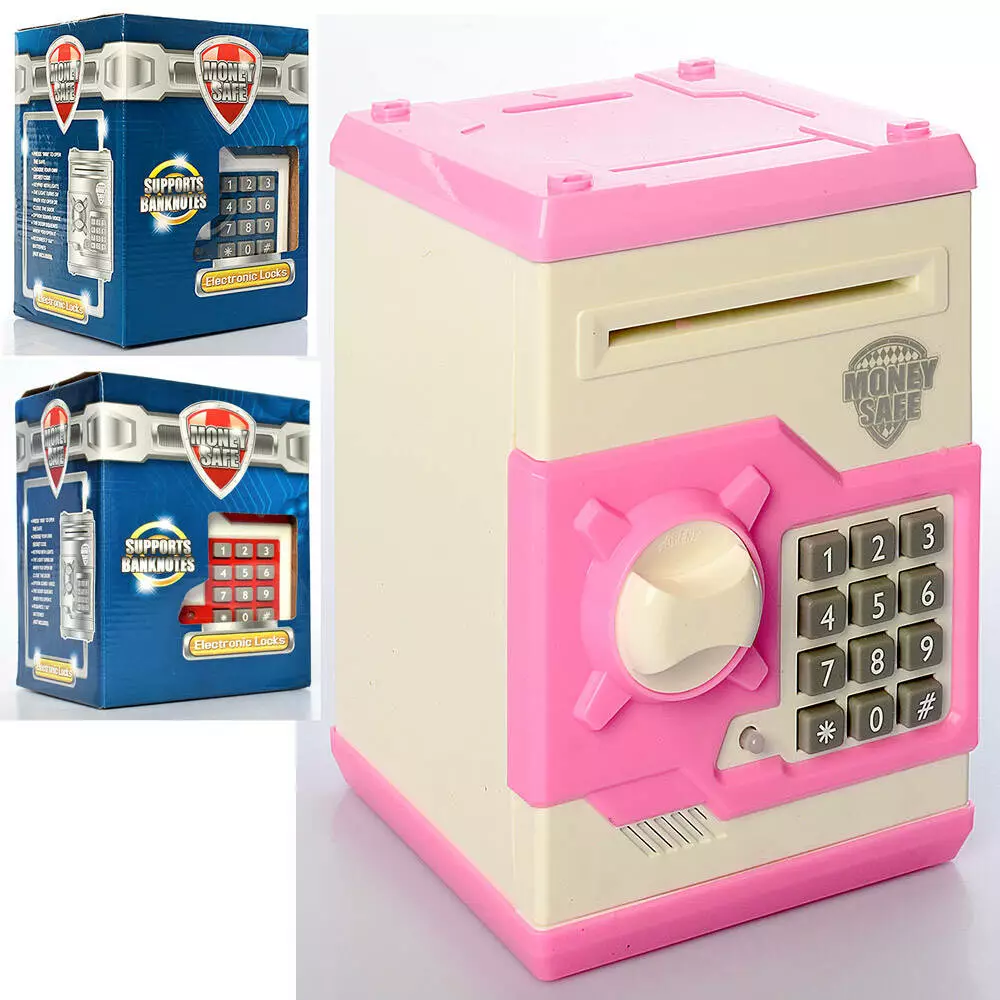 Скарбничка MK 3916 сейф, затягує купюри, мікс видів, муз., світло, бат., кор., 13,5-19-14 см.