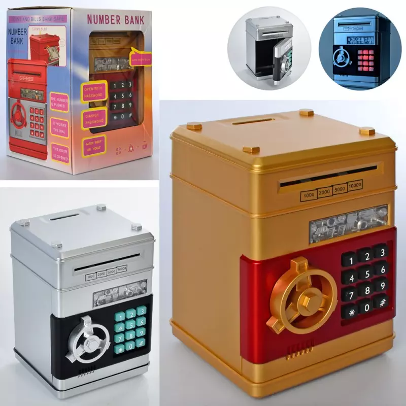 Скарбничка MK 4523 сейф з кодом, затяг.купюри, 2 кольори, муз., світло, бат., кор., 15-21-15см.