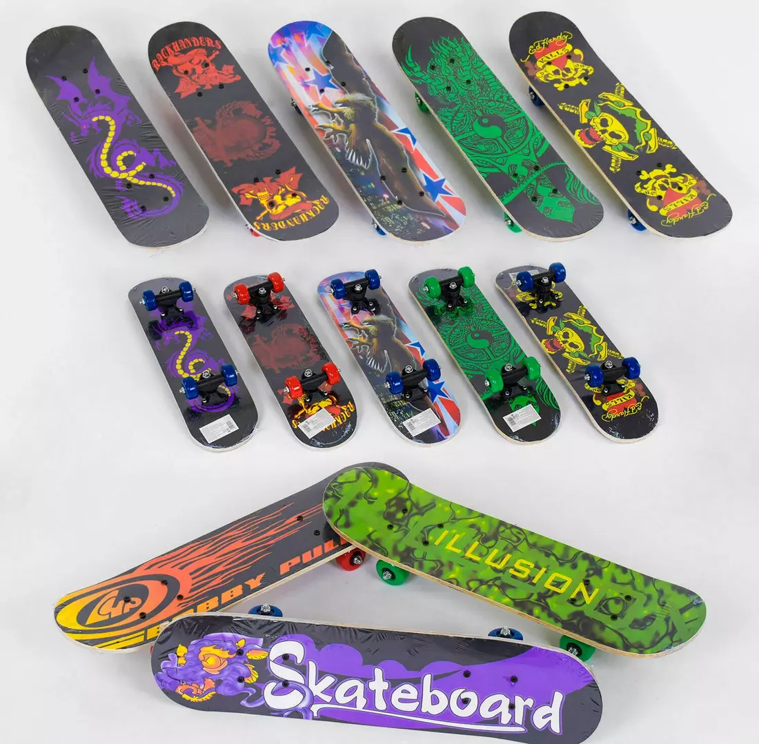 Скейтборд - вид транспортного засобу, який став одним із способів розваг і проведення дозвілля. Для дітей скейт - це активна гра, фізичний розвиток і веселе проведення часу. Даний скейт складається з деки і підвіски. Дека скейта виконана з декількох шарів. Кожен з 8-ми представлених скейтбордів оформлений оригінальними малюнками на будь-який смак. Такий скейт досить невеликих розмірів, підійде для діток в якості першого скейтборду. Дека увігнута з подвійним загином. Дека - дерево; Колеса - PVC; розміри: Дека: 60х15 см; Висота від підлоги: 10 см; Діаметр коліс: 5 см. Ширина коліс: 2 см.