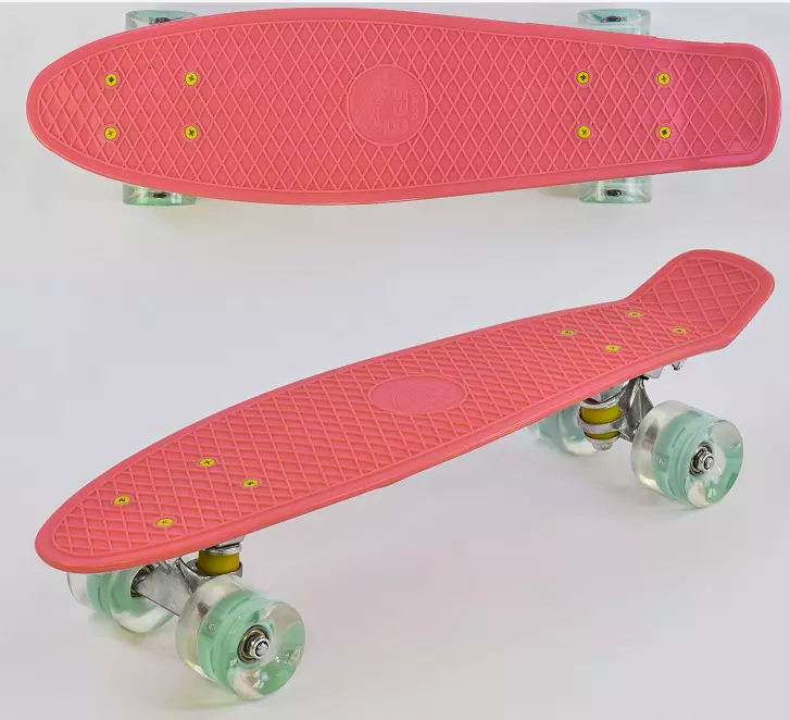 Маленький лонгборд, або, як його ще називають, пенні борд, стане відмінним подарунком для дитини чи підлітка. Для того, щоб кататися на такому скейті не потрібно особливих навичок, якщо ви звичайно не збираєтеся виконувати складні трюки і стрибки. Скейт відноситься до круїзним лонгбордах, призначеним для переміщення по міських рівних дорогах і відповідним для фрірайду, т. Е. «Вільного катання». Оригінальна обробка деки представлена у вигляді антиковзаючого покриття, за формою нагадує риб'ячу луску. Якісний пенніборд володіє класної маневреністю, їздить плавно і безшумно. Завдяки цим якостям круїзні Лонгборди отримали визнання серед професійних райдерів і новачків по всьому світу. Особливо ефектно виглядає катання у вечірній час, коли починає темніти, так як прозорі поліуретанові колеса скейта яскраво світяться в темряві. Технічні характеристики розміри: Довжина деки - 55 см; Діаметр коліс - 6 см. Ширина коліс - 4,5 см. матеріали: Дека - формований пластик + антиковзаюча поверхню; Колеса - PU (поліуретан) з підшипниками ABEC - 7; Підвіска - алюміній; Вантажопідйомність - 70 кг.