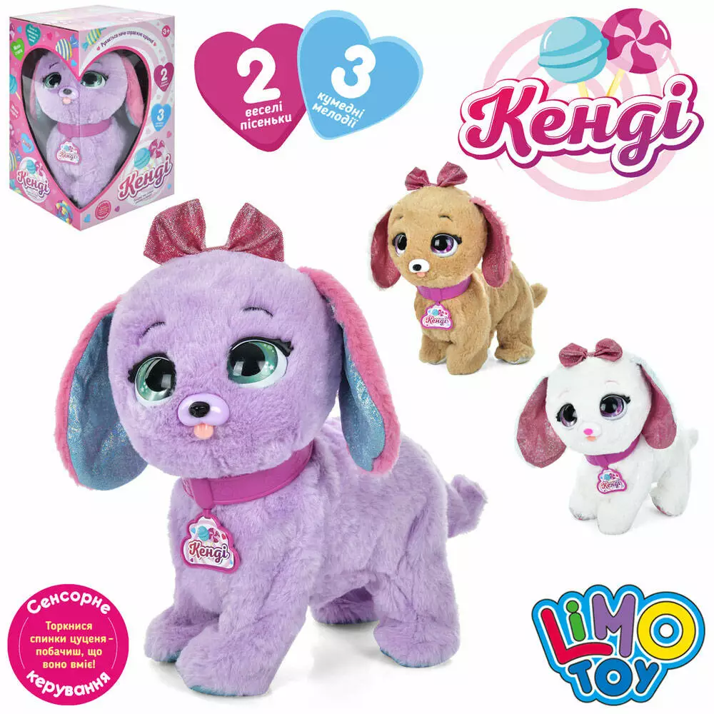Собака M 5701 I UA сенсорна, рухлива, плюш, 3 кольори, муз. (укр.), бат., кор., 19-30-17,5 см.