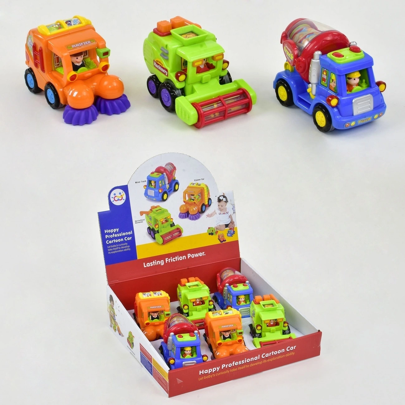 Розмір упаковки: 29 см ? 9 см ? 31 см Кольорові машинки познайомлять малюка зі деякими видами спецтехніки, а саме: з бетономішалкою, збиральної машиною і комбайном. Машинки обов'язково привернуть увагу малюка, виконані вони в яскравому дизайні. У кожній з них є водій. Для розроблення дрібної моторики і сенсорного розвитку на машинках є рухливі деталі і кнопочки.