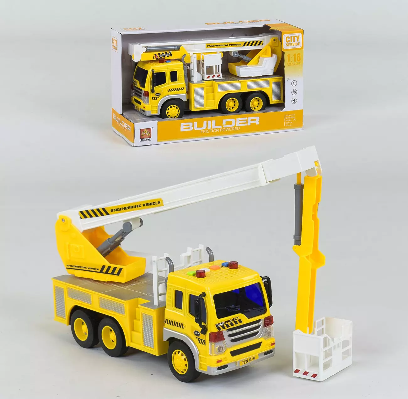 Вишка WY 310 G являє собою інерційну модель спецтехніки. Модель відмінно деталізована, тому стане відмінним подарунком для кожного малюка. Особливості моделі: - інерційний рух; - світяться проблискові маячки; - докладна деталізація; - 4 кнопки, які відповідають за звукові ефекти (звук ключа запалювання, задній хід, сигнал); Тип харчування автомобіля - 3 батарейки типу «AG13» (в комплекті).