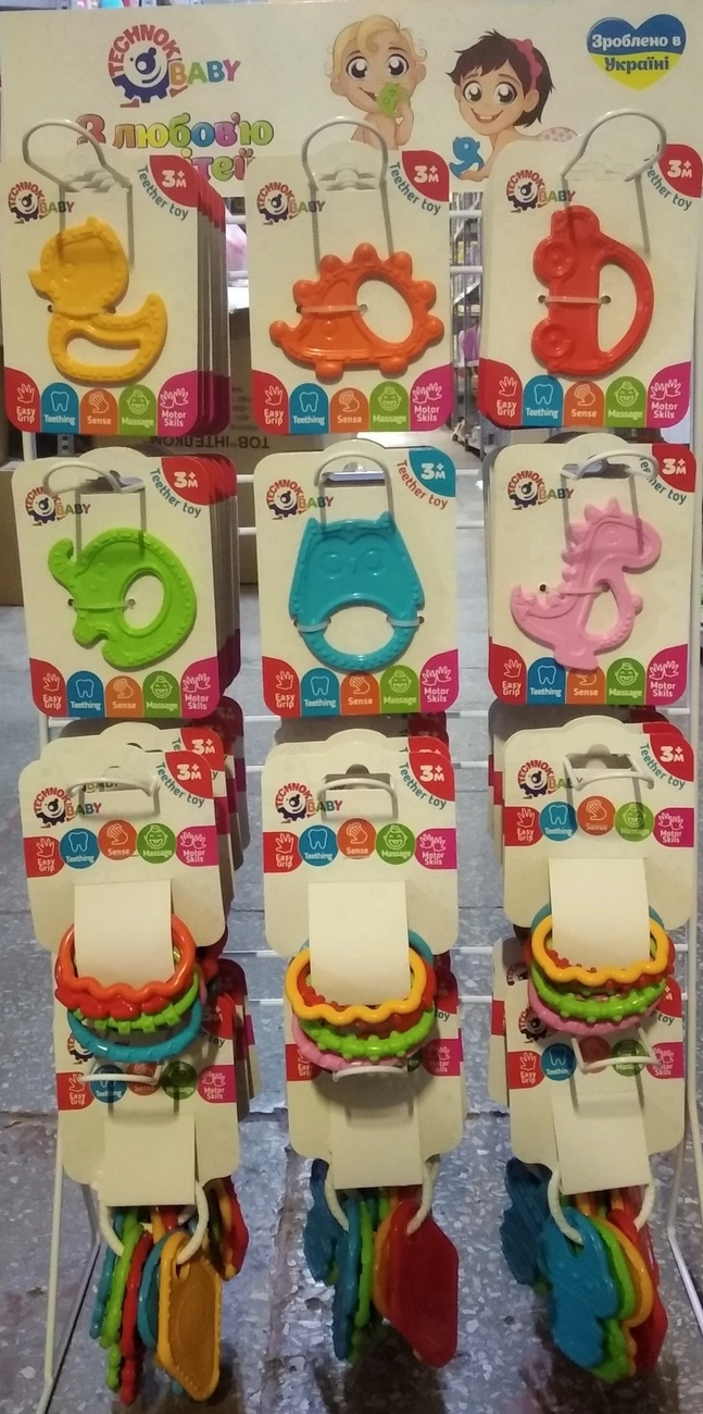 Стелаж з 60 прорізувачами В набір входять: - Стелаж (75см висота, 38см ширина) - Іграшка "Кільця ТехноК", арт.9147 - 12 штук - Іграшка "Прорізувачі - ключики ТехноК", арт.9154 - 12 штук - Іграшка "Прорізувач для зубів ТехноК", арт.9161 - 36 штук