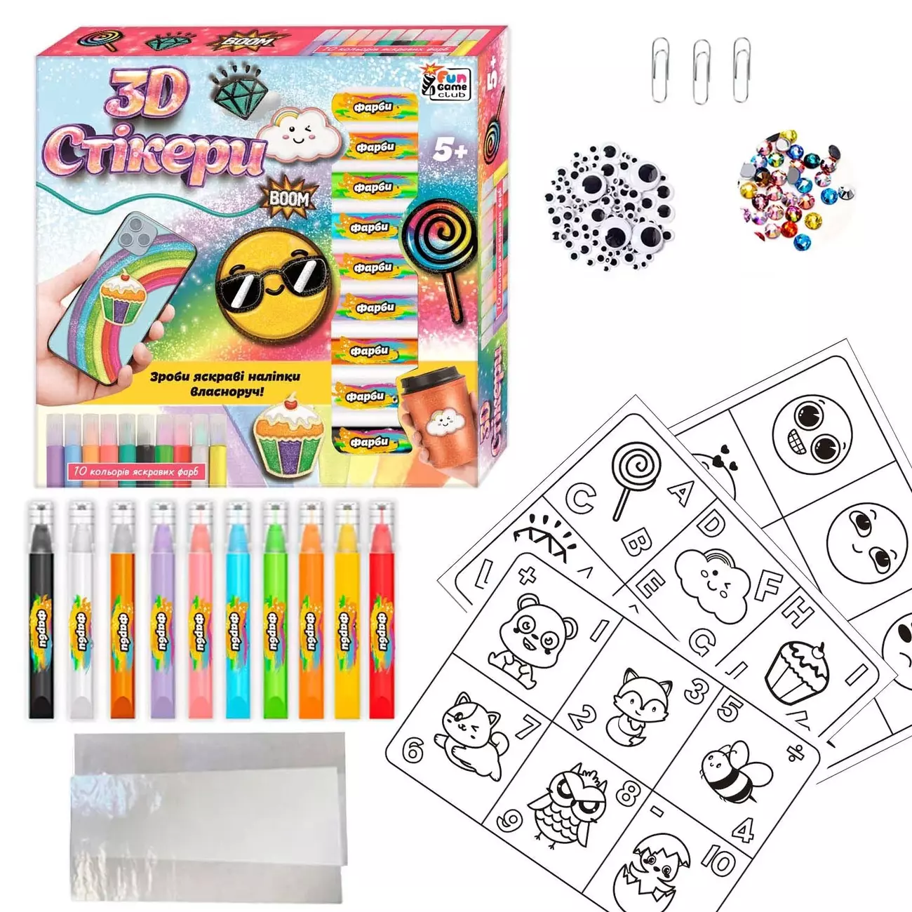 Зроби яскраві наліпки власноруч! Ігровий набір “3D Стікери” від "4FUN Game Club" - ідеальний варіант для цікавого і корисного дозвілля. Завдяки йому дитина зможе спробувати новий для себе вид творчості і виготовити унікальні об’ємні стікери, щоб прикрасити ними улюблені речі. Як робити?! 1. Покладіть підготовлений шаблон і обведіть контур чорною фарбою. 2. Розфарбуйте зображення всередині контуру. 3. Дайте йому висохнути, і наліпка буде готова. 4. Обережно зніміть її та приклейте на будь-яку гладку поверхню, наприклад, мобільний телефон. Комплектація ігрового набору: Скріпка - 3 шт. Пластикові оченята - 1 пакетик. Стрази - 1 пакетик. 10 тюбиків з фарбою по 12 мл. 3 аркуші з шаблонами. Прозорі основи для малювання - 3 шт.