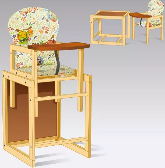 Дитячий стілець для годування великий. Виріб виконаний із дерева. Стільниця ламінована, світла, широка. Спинка велика. Трансформується у маленький стіл-стульчик.