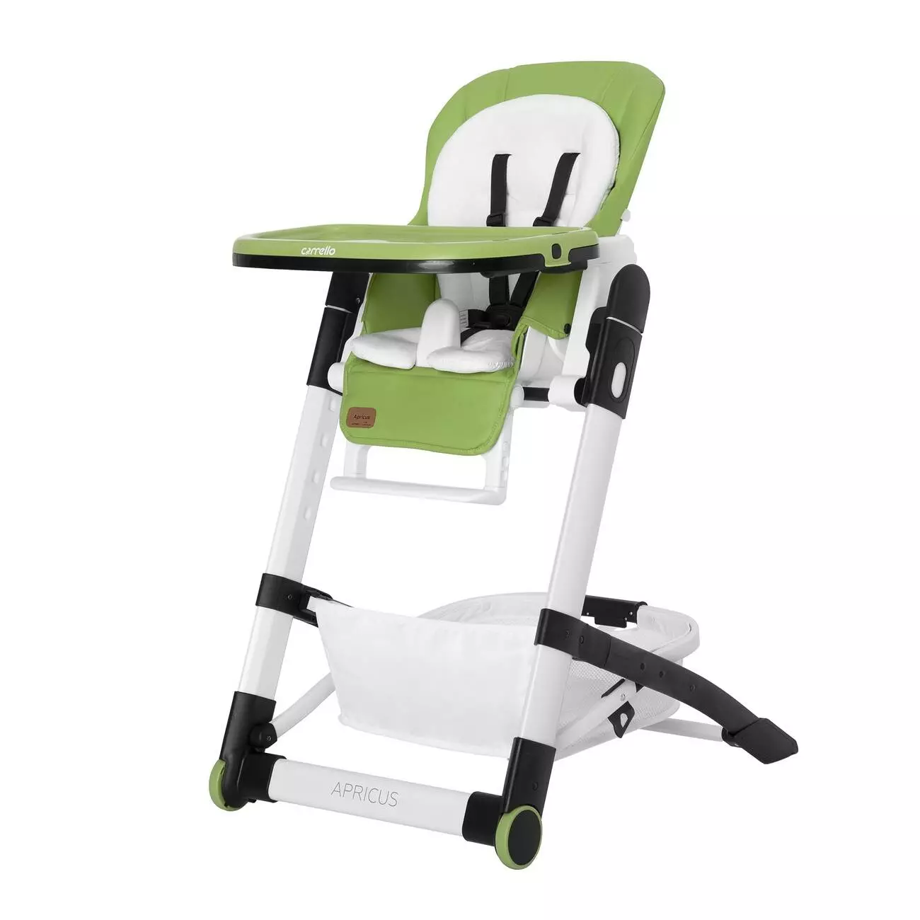 Стілець для годування CARRELLO Apricus призначений для дітей віком від 6 місяців. Має добре продуману стійку конструкцію та оснащений додатковими механізмами для надання більшої безпеки в експлуатації. Стілець виготовлений з високоякісної сталі та пластику. Окрім п’ятиточкових ременів безпеки він має стільницю, яка легко встановлюється з однієї руки, проте після встановлення знімається лише з допомогою натискання двох кнопок на обох підлокітниках, що виключає можливість її виштовхування дитиною. Стільниця подвійна та легко миється. Скласти стілець можна лише натиснувши одночасно дві кнопки на ручці корзини, що, в свою чергу, забезпечує стійкість конструкції та запобігає випадковому складанню. Корзина стільчика ємна, містка та має міцне дно. Стільчик має шість позицій висоти та п’ять положень спинки, найнижче положення кута нахилу спинки – 140 градусів. Кут нахилу підніжки та її довжину, в свою чергу, можна встановлювати у три різних положення. Розмір коробки - 56х29х93 см