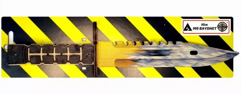 Ніж сувенірний "M9 Bayonet" — штик ніж. Материал: фанера. Довжина ножа — 27 см, ширина ручки — 2,5 см. Чудовий подарунок-сувенір. Ніж дерев'яний, якісний і міцний. Не заточений, гострі частини заокруглені та зашліфовані, повністю безпечний. Для дітей від 6 років.
