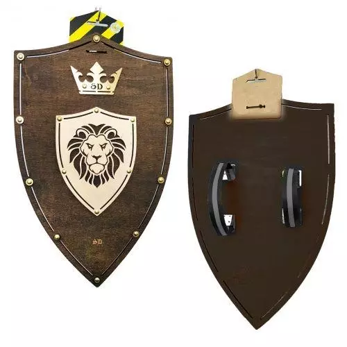 Модель щита із фанери (товщина 6 мм.). Лицьова сторона прикрашена зображенням лева; є декоративні елементи на корпусі; 2 тканинні ручки на звороті щита. Розмір 29х46 см.