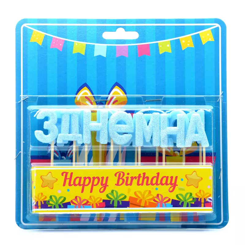 Свічка для торта побуквенна "З Днем народження" блакитні блиск