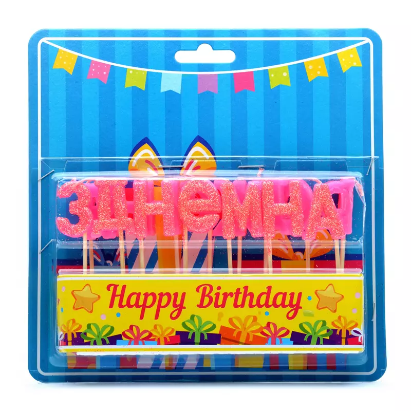Свічка для торта побуквенна "З Днем народження" рожеві блиск