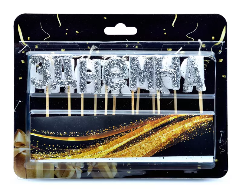 Свічки-букви, які складають напис "З Днем народження" відмінно підійдуть для торта або інших десертів Свічки вироблено з якісного парафіну у формі букв білого кольору, посипані зверху срібним глітером великої фракції Розміри: 14,5 см х 3 см (разом з паличкою - 14,5 см х 6,5 см)