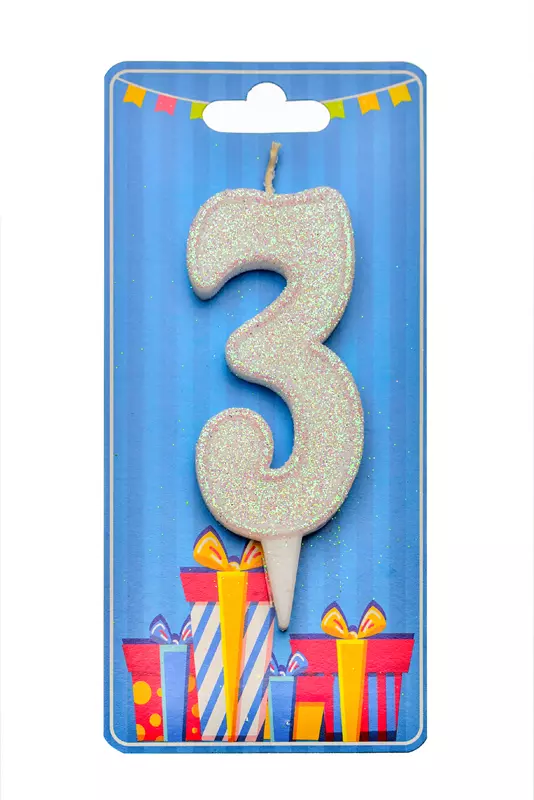 Свічка у формі цифри "3" відмінно підійде для декорування торта або інших десертів Свічку вироблено з якісного парафіну у формі цифри білого кольору, посипана зверху білим глітером середньої фракції Розміри: 9,5 см х 3,5 см