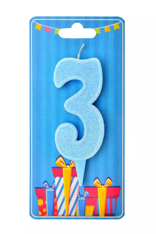 Свічка у формі цифри "3" відмінно підійде для декорування торта або інших десертів Свічку вироблено з якісного парафіну у формі цифри блакитного кольору, посипана зверху білим глітером середньої фракції Розміри: 9,5 см х 3,5 см