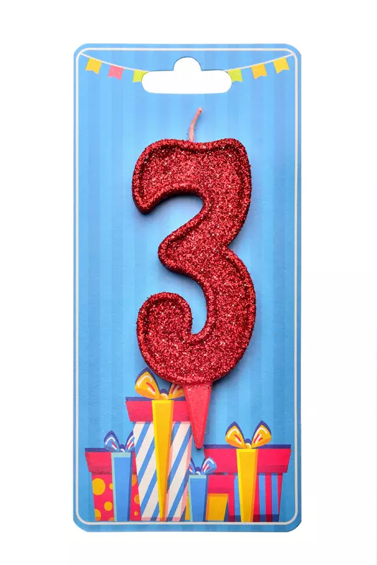 Свічка у формі цифри "3" відмінно підійде для декорування торта або інших десертів Свічку вироблено з якісного парафіну у формі цифри червоного кольору, посипана зверху червоним глітером середньої фракції Розміри: 9,5 см х 3,5 см