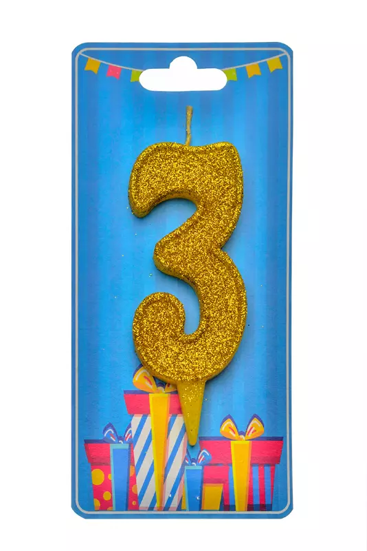 Свічка у формі цифри "3" відмінно підійде для декорування торта або інших десертів Свічку вироблено з якісного парафіну у формі цифри жовтого кольору, посипана зверху золотим глітером середньої фракції Розміри: 9,5 см х 3,5 см