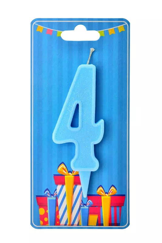 Свічка у формі цифри "4" відмінно підійде для декорування торта або інших десертів Свічку вироблено з якісного парафіну у формі цифри блакитного кольору, посипана зверху райдужним глітером середньої фракції Розміри: 9,5 см х 3,5 см
