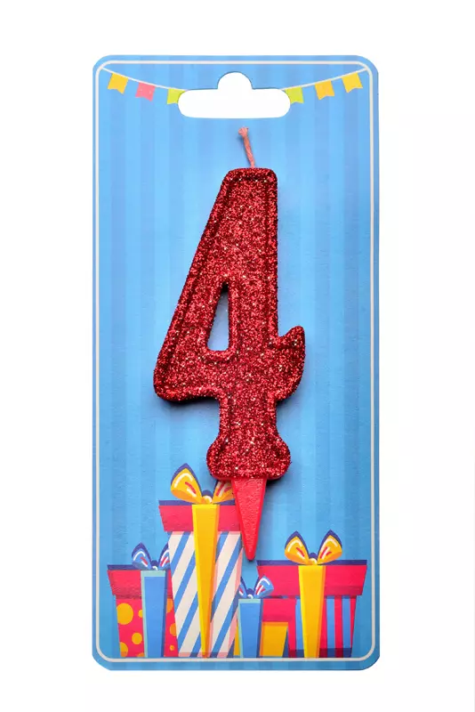 Свічка у формі цифри "4" відмінно підійде для декорування торта або інших десертів Свічку вироблено з якісного парафіну у формі цифри червоного кольору, посипана зверху червоним глітером середньої фракції Розміри: 9,5 см х 3,5 см
