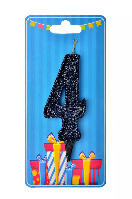 Свічка у формі цифри "4" відмінно підійде для декорування торта або інших десертів Свічку вироблено з якісного парафіну у формі цифри чорного кольору, посипана зверху чорним глітером середньої фракції Розміри: 9,5 см х 3,5 см