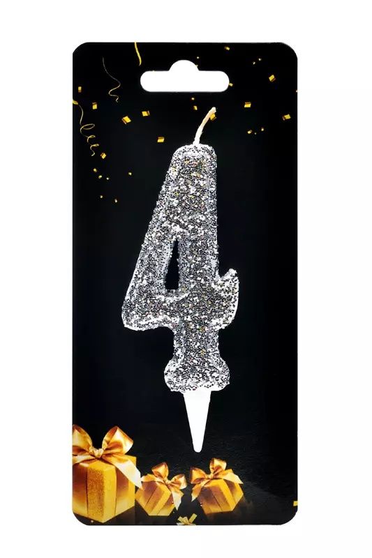 Свічка у формі цифри "4" відмінно підійде для декорування торта або інших десертів Свічку вироблено з якісного парафіну у формі цифри білого кольору, посипана зверху срібним глітером великої фракції Розміри: 9 см х 3,5 см