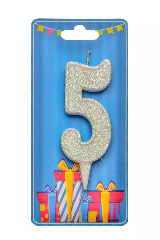 Свічка у формі цифри "5" відмінно підійде для декорування торта або інших десертів Свічку вироблено з якісного парафіну у формі цифри білого кольору, посипана зверху білим глітером середньої фракції Розміри: 9,5 см х 3,5 см