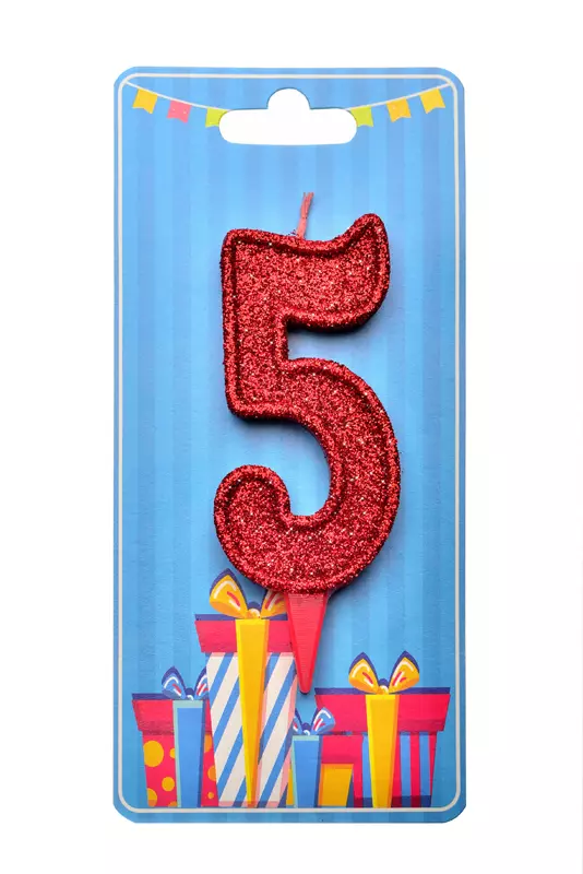 Свічка у формі цифри "5" відмінно підійде для декорування торта або інших десертів Свічку вироблено з якісного парафіну у формі цифри червоного кольору, посипана зверху червоним глітером середньої фракції Розміри: 9,5 см х 3,5 см