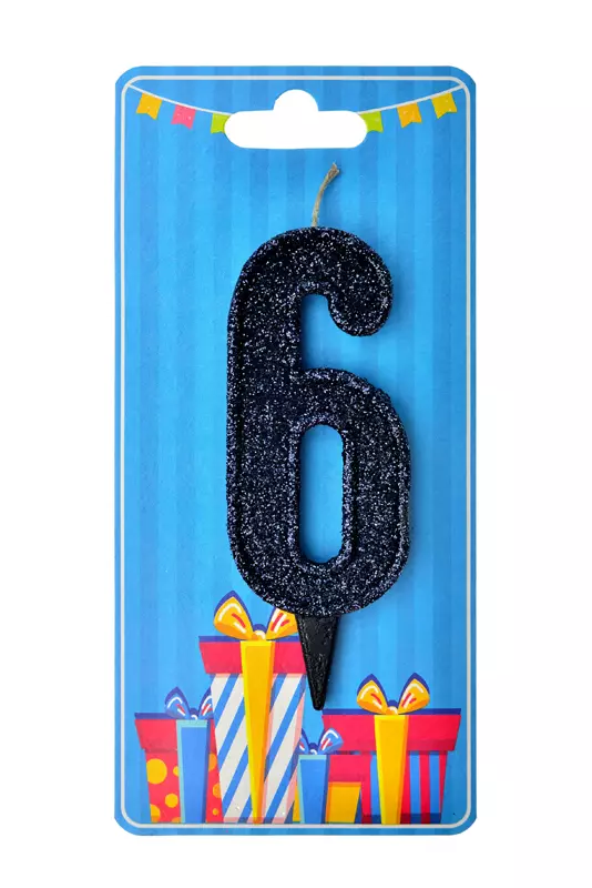 Свічка у формі цифри "6" відмінно підійде для декорування торта або інших десертів Свічку вироблено з якісного парафіну у формі цифри чорного кольору, посипана зверху чорним глітером середньої фракції Розміри: 9,5 см х 3,5 см