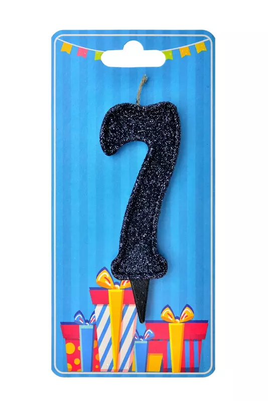 Свічка у формі цифри "7" відмінно підійде для декорування торта або інших десертів Свічку вироблено з якісного парафіну у формі цифри чорного кольору, посипана зверху чорним глітером середньої фракції Розміри: 9,5 см х 3,5 см