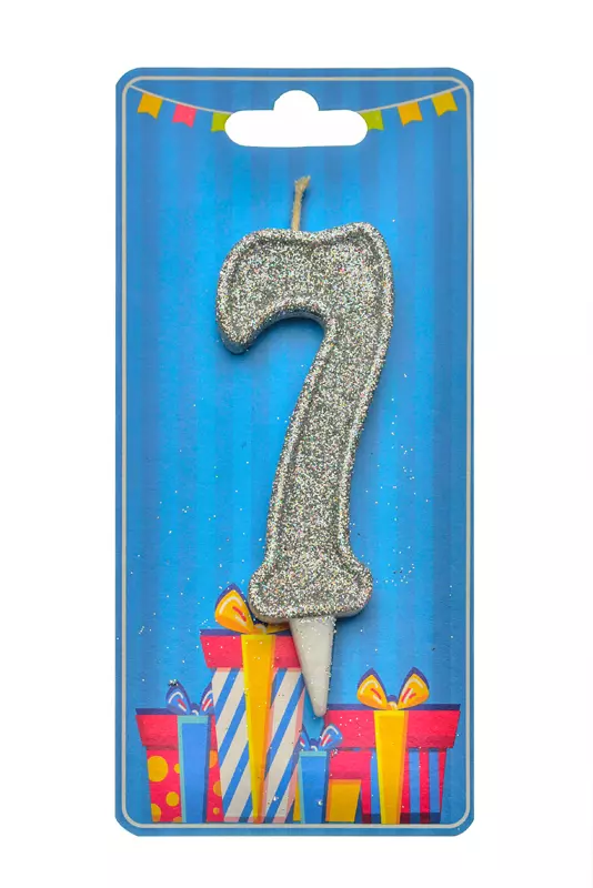 Свічка у формі цифри "7" відмінно підійде для декорування торта або інших десертів Свічку вироблено з якісного парафіну у формі цифри білого кольору, посипана зверху срібним глітером середньої фракції Розміри: 9,5 см х 3,5 см