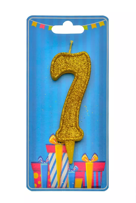 Свічка у формі цифри "7" відмінно підійде для декорування торта або інших десертів Свічку вироблено з якісного парафіну у формі цифри жовтого кольору, посипана зверху золотим глітером середньої фракції Розміри: 9,5 см х 3,5 см