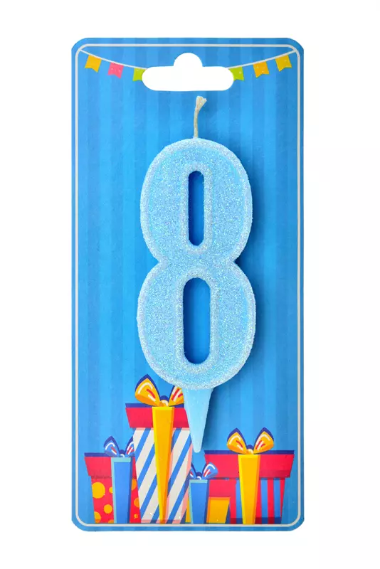 Свічка у формі цифри "8" відмінно підійде для декорування торта або інших десертів Свічку вироблено з якісного парафіну у формі цифри блакитного кольору, посипана зверху білим глітером середньої фракції Розміри: 9,5 см х 3,5 см