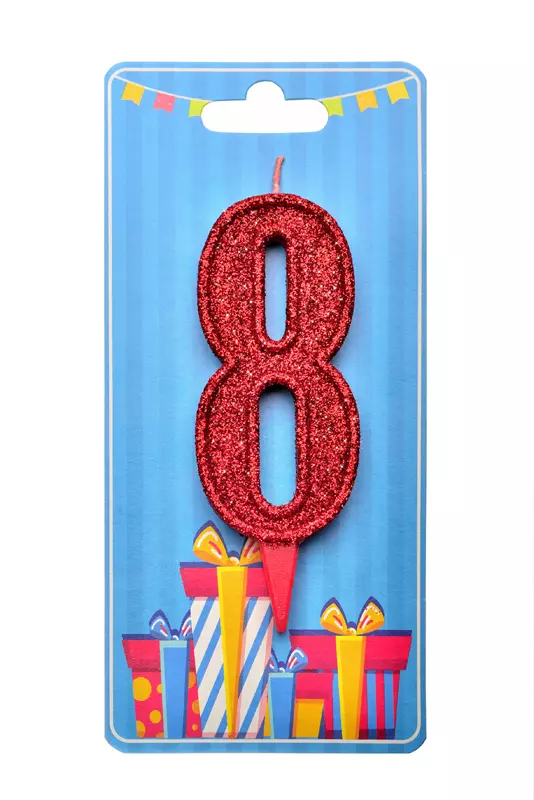 Свічка у формі цифри "8" відмінно підійде для декорування торта або інших десертів Свічку вироблено з якісного парафіну у формі цифри червоного кольору, посипана зверху червоним глітером середньої фракції Розміри: 9,5 см х 3,5 см