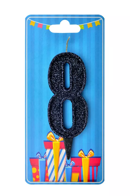 Свічка у формі цифри "8" відмінно підійде для декорування торта або інших десертів Свічку вироблено з якісного парафіну у формі цифри чорного кольору, посипана зверху чорним глітером середньої фракції Розміри: 9,5 см х 3,5 см