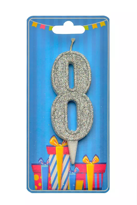 Свічка у формі цифри "8" відмінно підійде для декорування торта або інших десертів Свічку вироблено з якісного парафіну у формі цифри білого кольору, посипана зверху срібним глітером середньої фракції Розміри: 9,5 см х 3,5 см