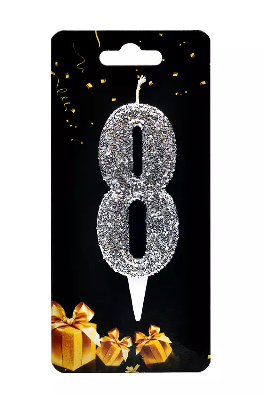 Свічка у формі цифри "8" відмінно підійде для декорування торта або інших десертів Свічку вироблено з якісного парафіну у формі цифри білого кольору, посипана зверху срібним глітером великої фракції Розміри: 9 см х 3,5 см
