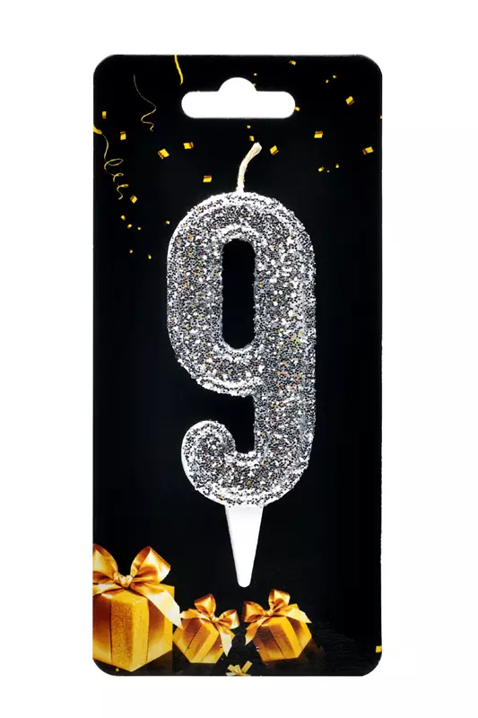Свічка у формі цифри "9" відмінно підійде для декорування торта або інших десертів Свічку вироблено з якісного парафіну у формі цифри білого кольору, посипана зверху срібним глітером великої фракції Розміри: 9 см х 3,5 см