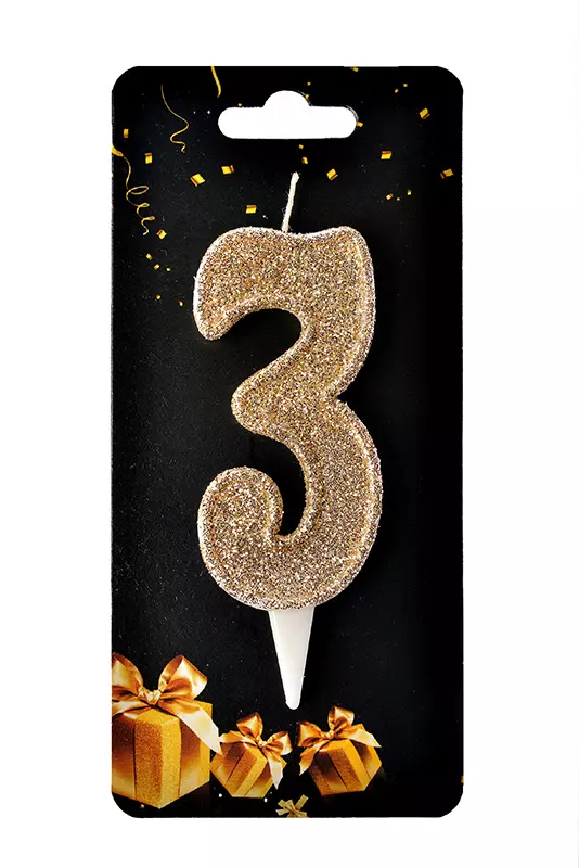 Свічка у формі цифри "3" відмінно підійде для декорування торта або інших десертів. Свічку вироблено з якісного парафіну у формі цифри білого кольору, посипана зверху глітером середньої фракції кольору золоте капучино. Розміри: 9,5 см х 3,5 см.