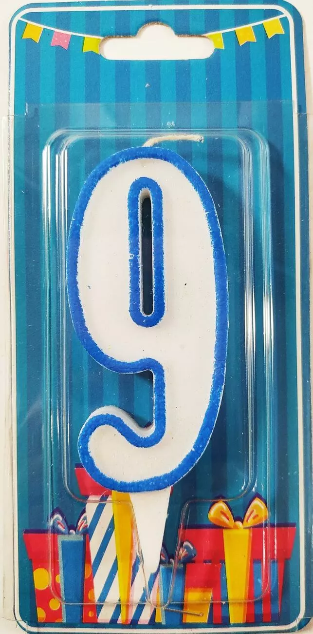 Свічка цифра "9 " біла блакитний контур